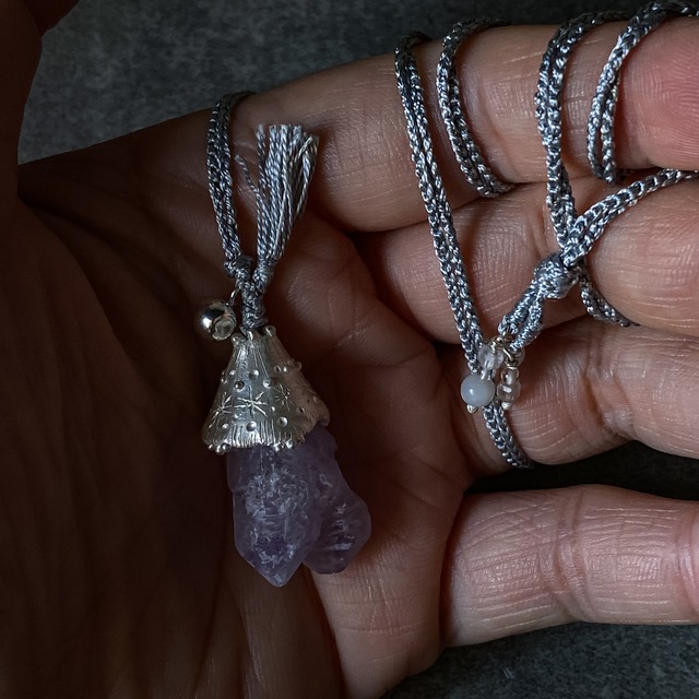 魔法のある世界のお話やファンタジーが大好きです。 空飛ぶ箒や大きなお鍋でぐつぐつ煮られる魔法のくすり。 きらめく鉱石の原石のかたまりやたくさんのハーブがつめられたガラス瓶がずらりと並べられた棚。 とんがり帽子をかぶり、森の中でただずむ魔法使い。 そんなファンタジーの世界をイメージして魔法使いの帽子をモチーフにした模様を刻んだシルバーのパーツに優しい色味のラベンダーカラーのお色のアメジストの原石を留めたトップ。 シルクで編んだオリジナルの紐に下げています。 箒のさきをイメージして紐と同じシルクの糸のタッセルを添えています。 今回の帽子の模様は夜空に輝く星たちをイメージしたデザイン。 夜と星の魔法使いの帽子です。 首回りの紐は同素材のアジャストパーツで長さの調節ができます。 存在感のあるトップがコーディネートのポイントになるアイテムです。 【*こちら一点物となります。sold outになりましたら同じものの追納はございません。予めご了承ください。】 トップパーツ:縦約3cm 横約1.5cm 首回り寸:約81cm 素材:925silver アメジスト 淡水パール ムーンストーン silk 紐色:グレー 重さ:約9.7g 天然石・シルバー製品のお取り扱い注意点 シルバー製品は空気に触れると硫化して黒くなる性質があります。 着用して汗や脂が付着したままだと黒く変色しやすいので、 着用後は柔らかい布・セ−ム皮等で汚れを拭き取って保管して下さい。 強い衝撃を与えたり、過度に引っ張ったりされますと変型、 破損する恐れがありますので御注意下さい。 怪我/アイテム本体の劣化防止の為、スポーツ等激しい運動時や お風呂等水に濡れるような場合はアイテムの着用をお避け下さい。 着用されてお肌にかゆみ・肌荒れ等の異常を感じた場合は 着用をお止め下さい。 着用を止めても肌の異常治まらない場合は医師に御相談下さい。