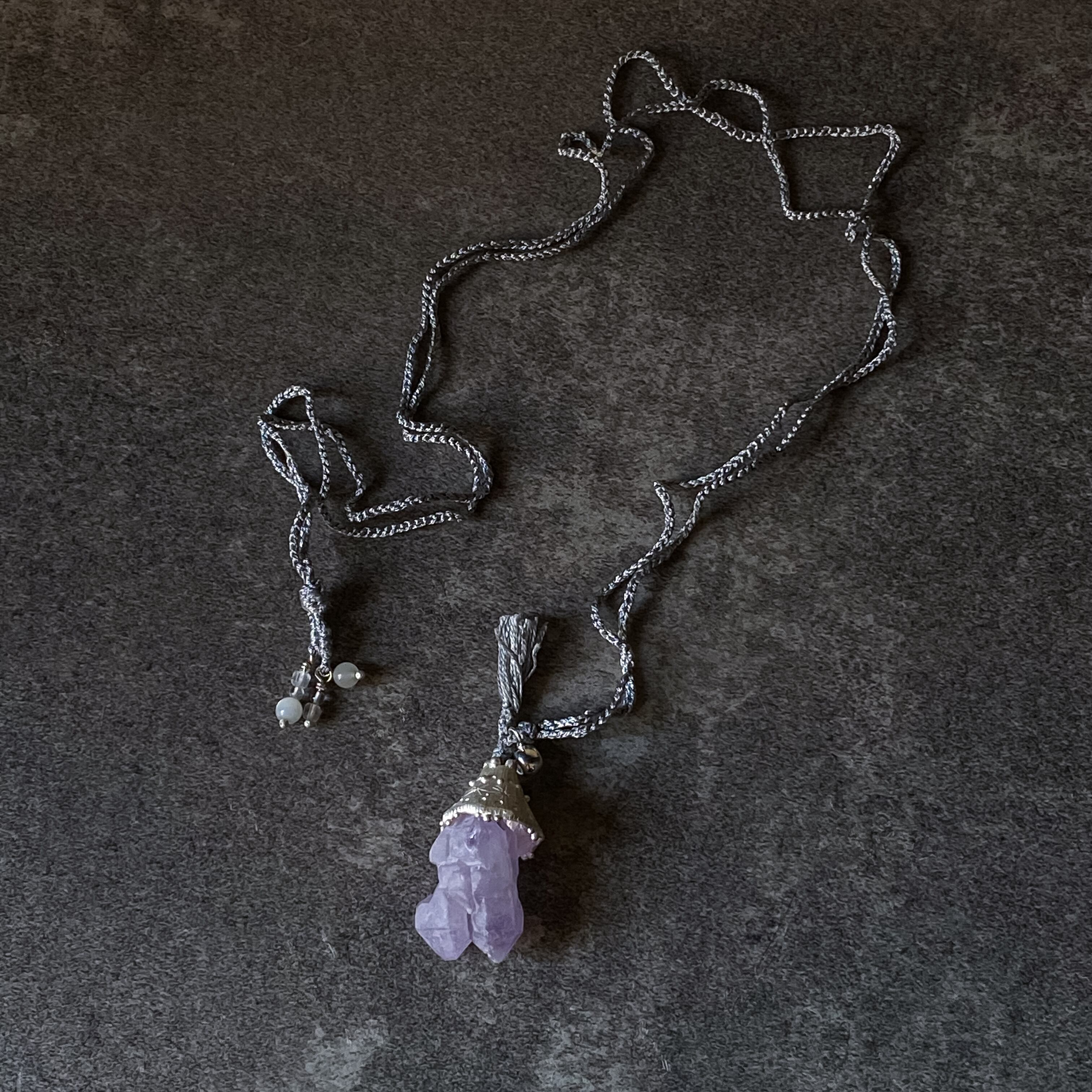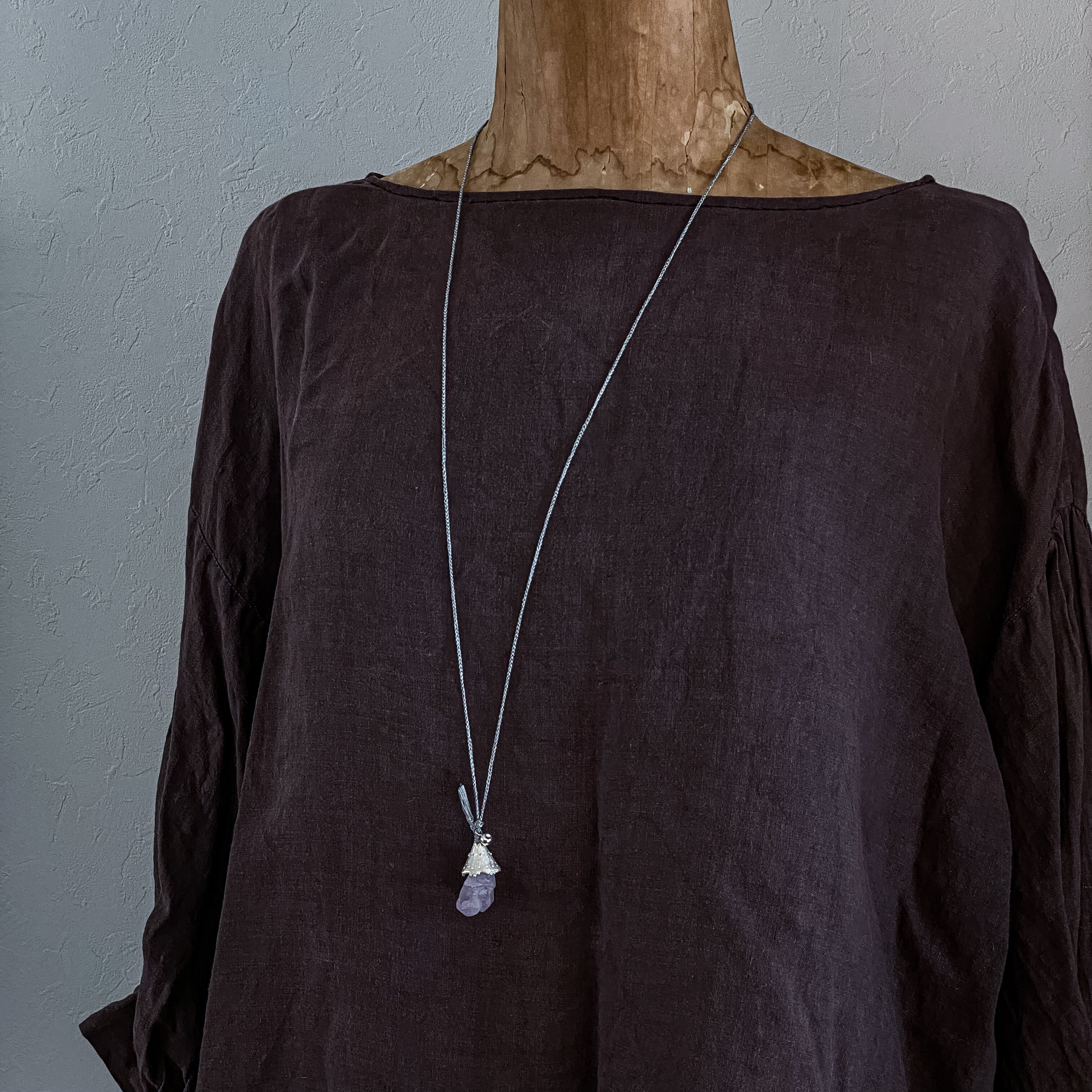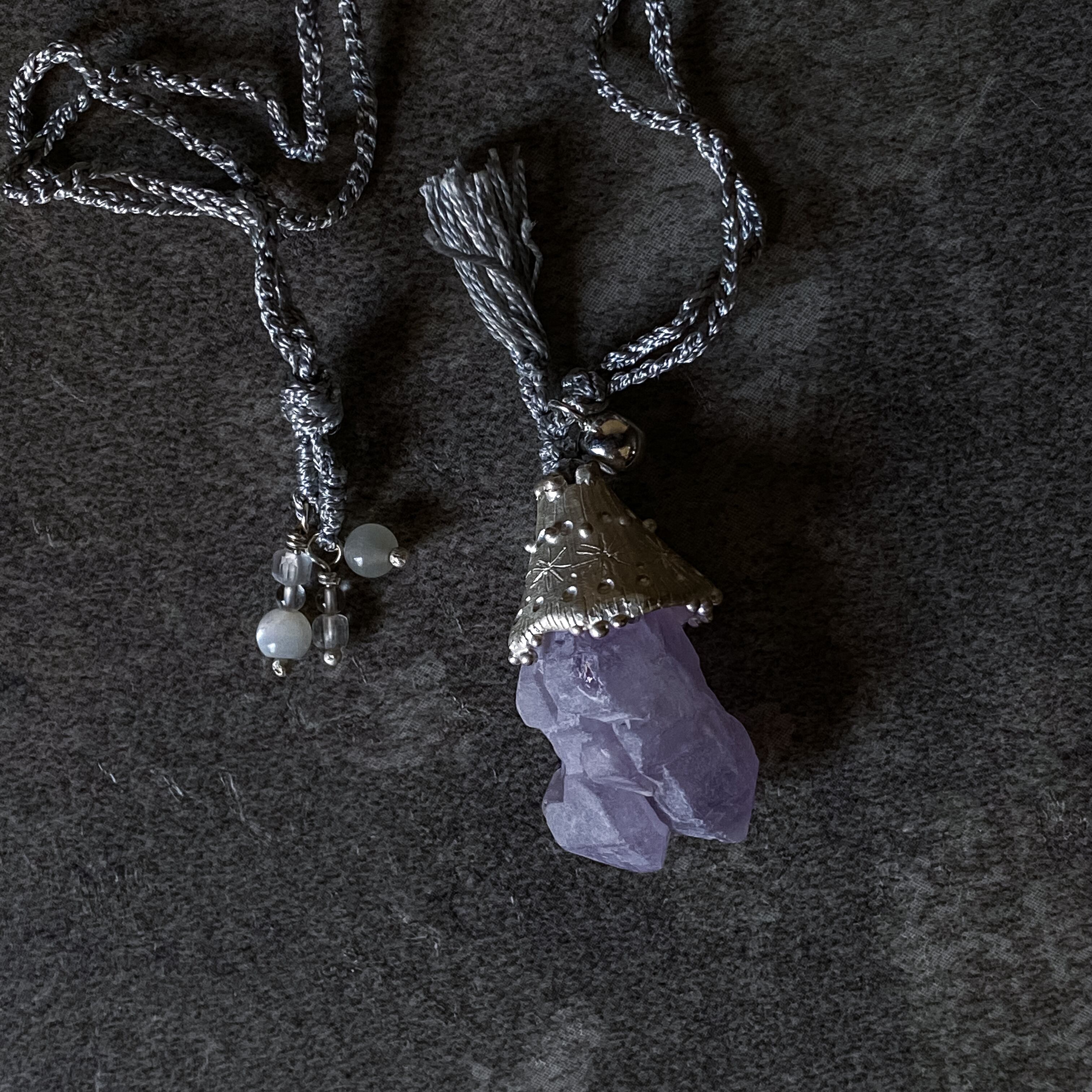 そんなファンタジーの世界をイメージして魔法使いの帽子をモチーフにした模様を刻んだシルバーのパーツに優しい色味のラベンダーカラーのお色のアメジストの原石を留めたトップ。