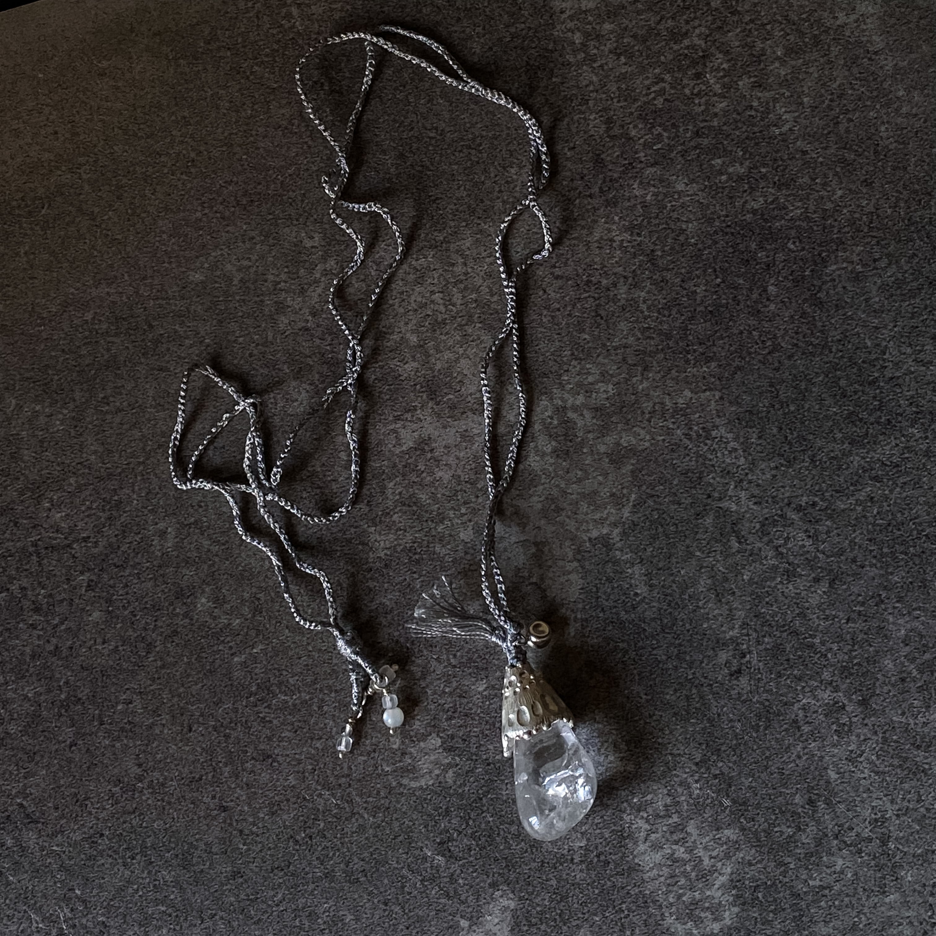 そんなファンタジーの世界をイメージして魔法使いの帽子をモチーフにした模様を刻んだシルバーのパーツに透明感のある水晶の原石を留めたトップ。