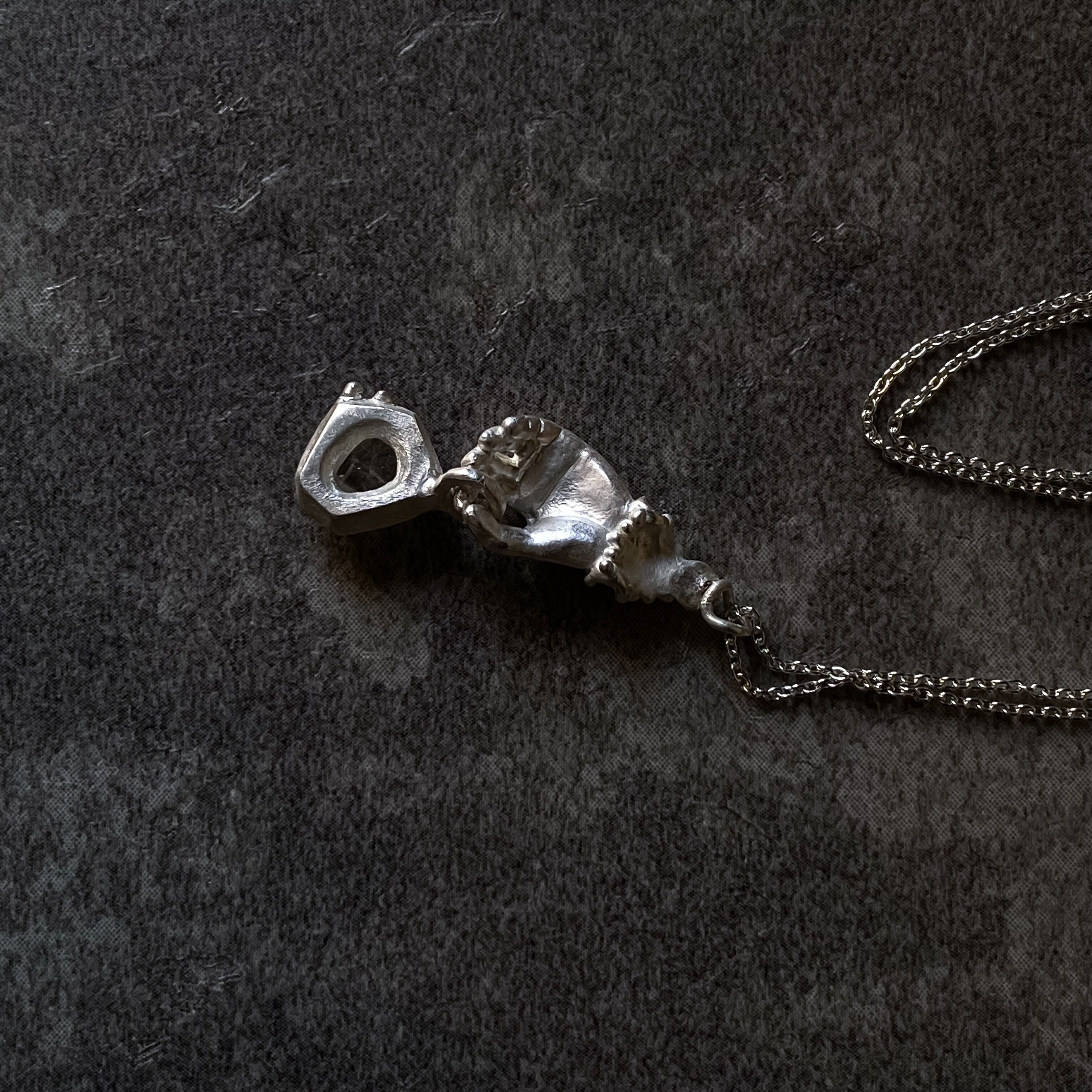 その手の先に小さな水晶が留まった石座を掴むデザインに。